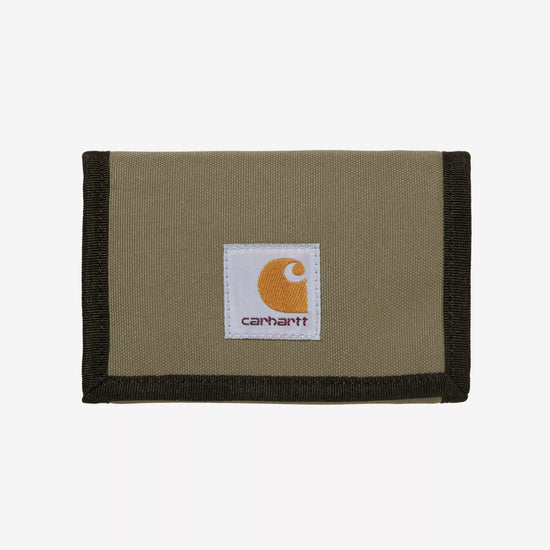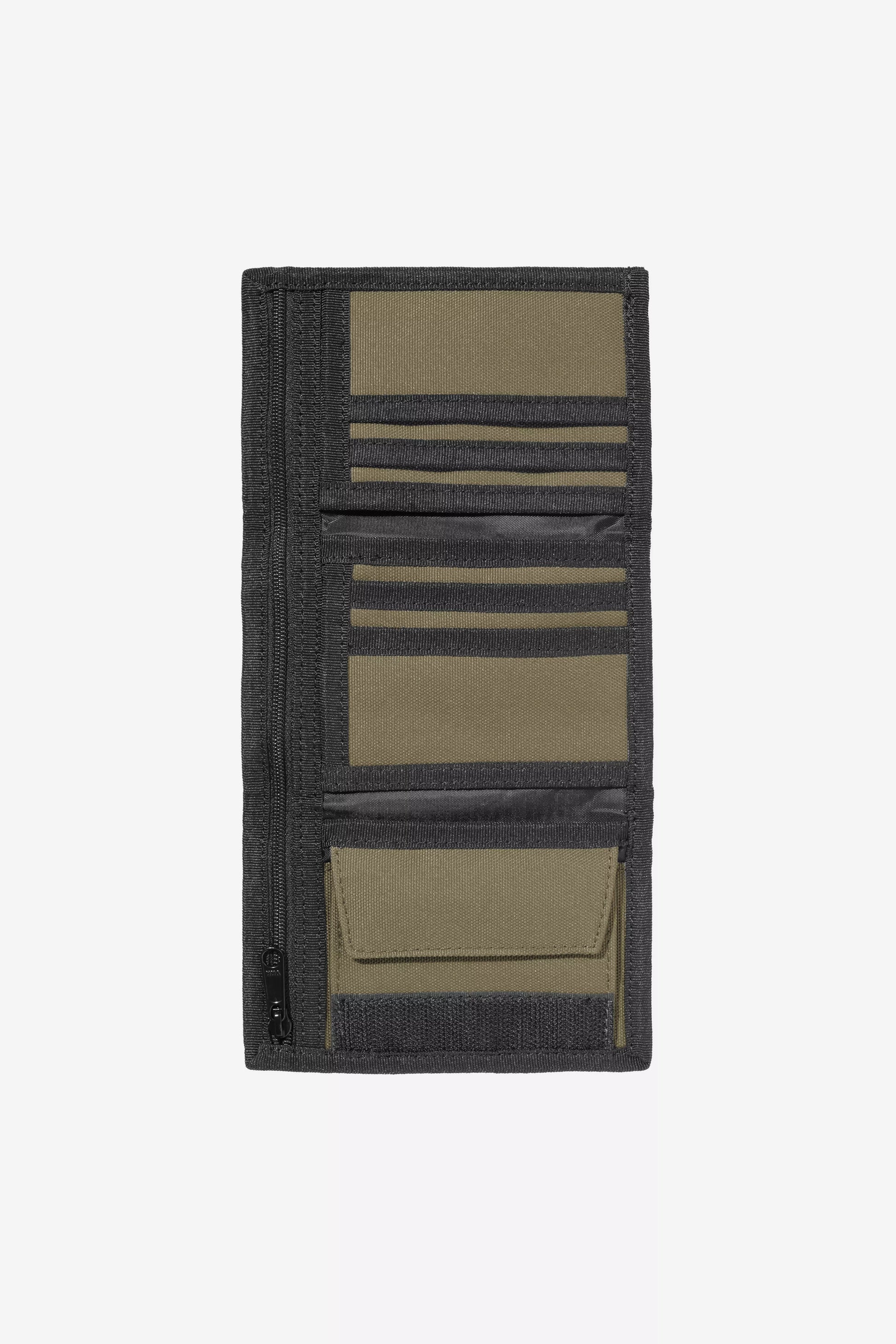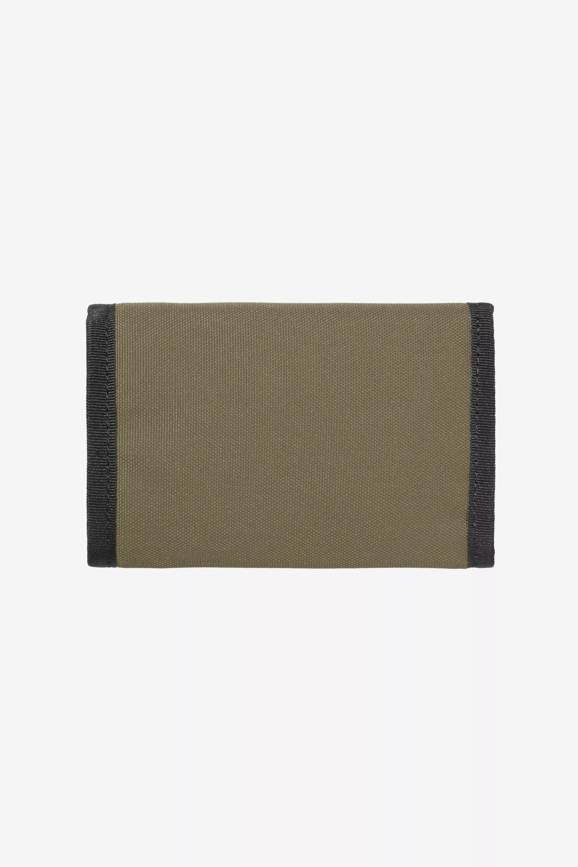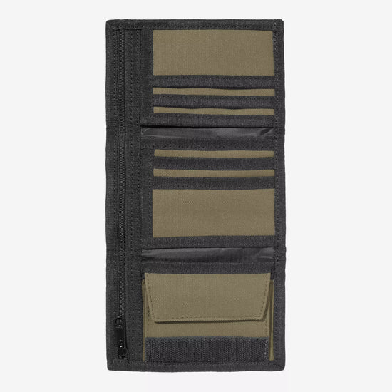 Le portefeuille 'Alec' est conçu en toile Duck, un tissu résistant composé de polyester recyclé. Déperlant, il dispose d'un compartiment à billets zippé, six fentes pour cartes ainsi qu'un porte-monnaie en Velcro® derrière lesquels se trouve des compartiments cachés.