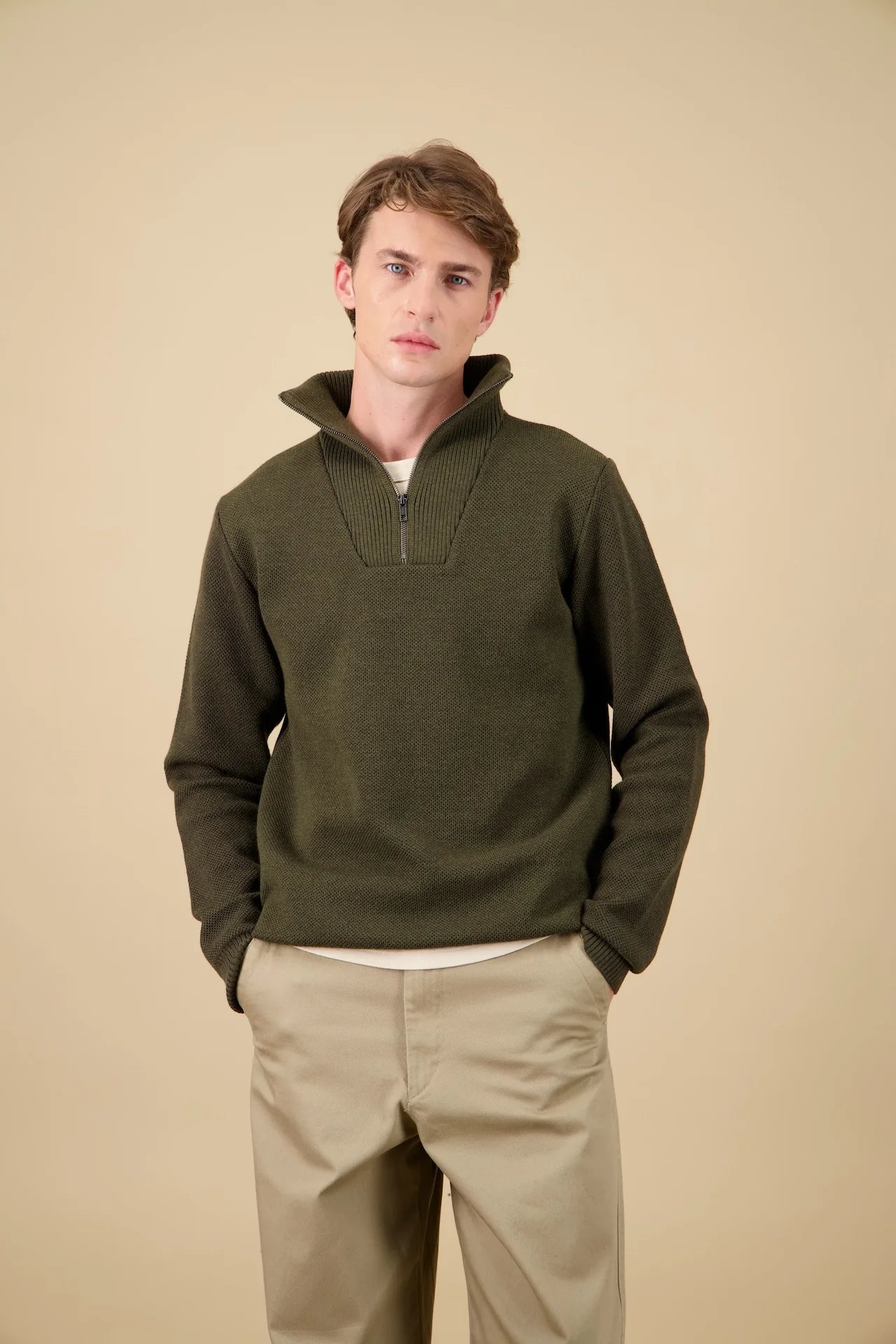 Un peu d’histoire : dans les années 1920, le pull camionneur était l’allié des chauffeurs routiers et des ouvriers. Pratique et fonctionnel, son col montant les protégeait du froid, tandis que le zip permettait d’ouvrir ou de refermer le col sans retirer le pull - idéal pour les changements de température entre les espaces intérieurs et extérieurs.
